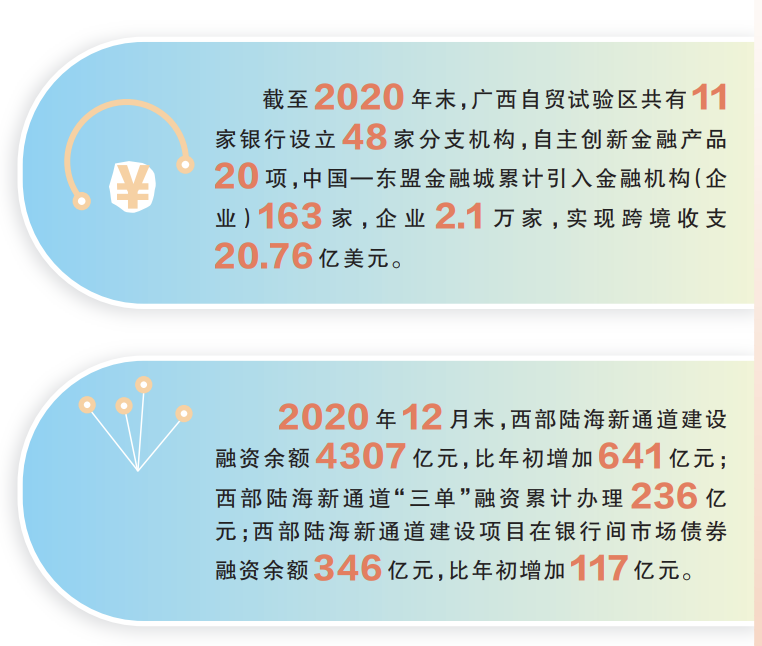 截至2020年末,广西自贸试验区共有11家银行设立48家分支机构,自主创新金融产品20项,中国—东盟金融城累计引入金融机构(企业)163家,企业2.1万家,实现跨境收支20.76亿美元。