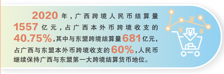 2020年,广西跨境人民币结算量1557亿元,占广西本外币跨境收支的40.75%,其中与东盟跨境结算量681亿元,占广西与东盟本外币跨境收支的60%,人民币继续保持广西与东盟第一大跨境结算货币地位。